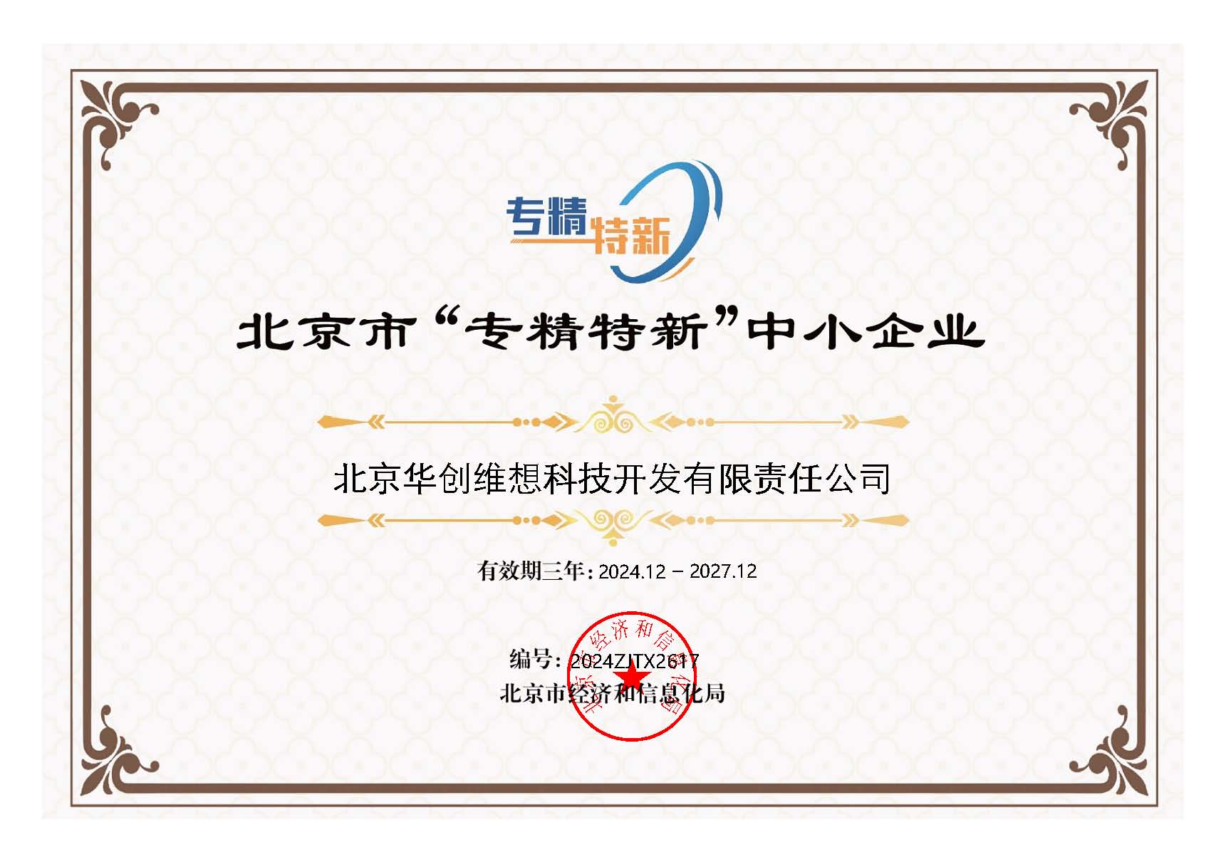 喜報—華創維想獲得北京市“專精特新”中小企業證書